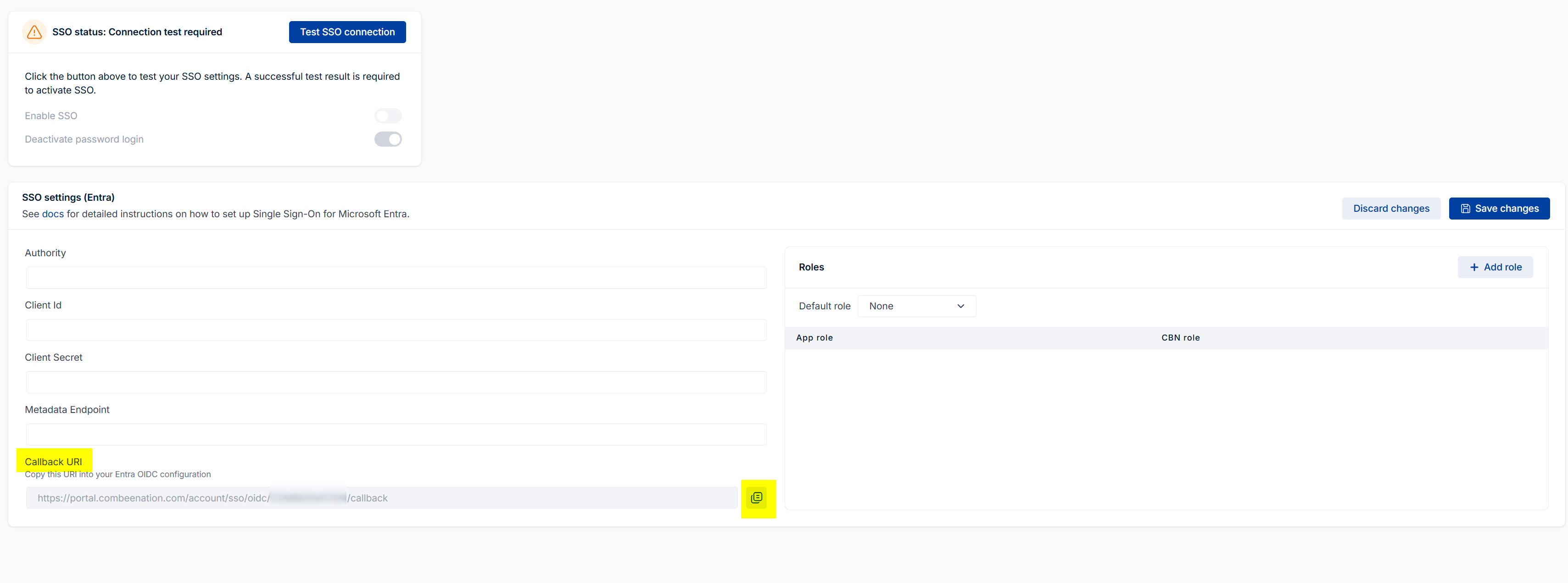 On the Combeenation SSO settings page, choose a Default role for your users. This role will be assigned to users that have not been assigned a (known) App role in Entra.