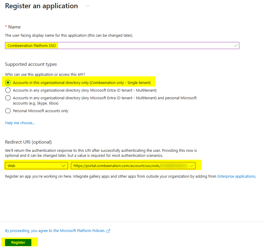 Enter a name for your app, such as “Combeenation Platform SSO”