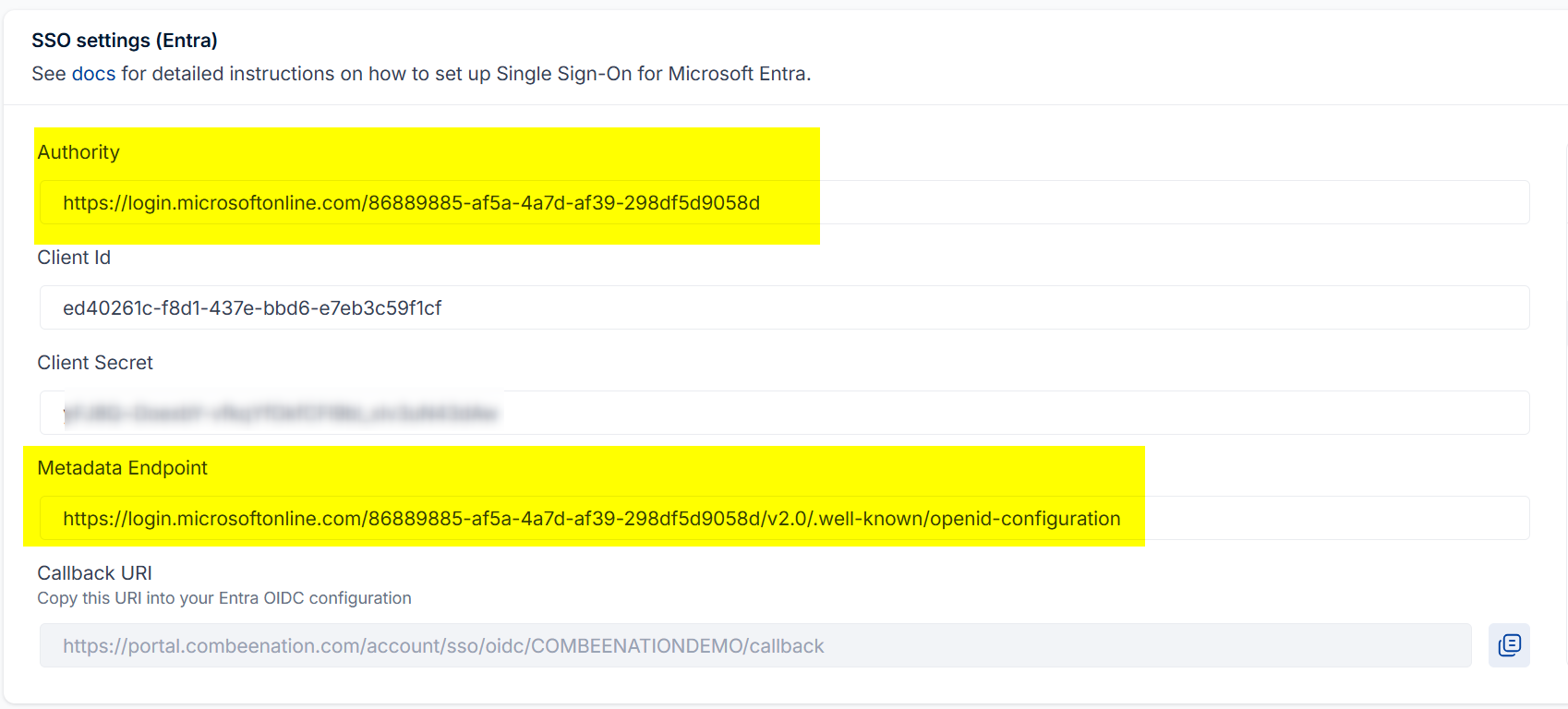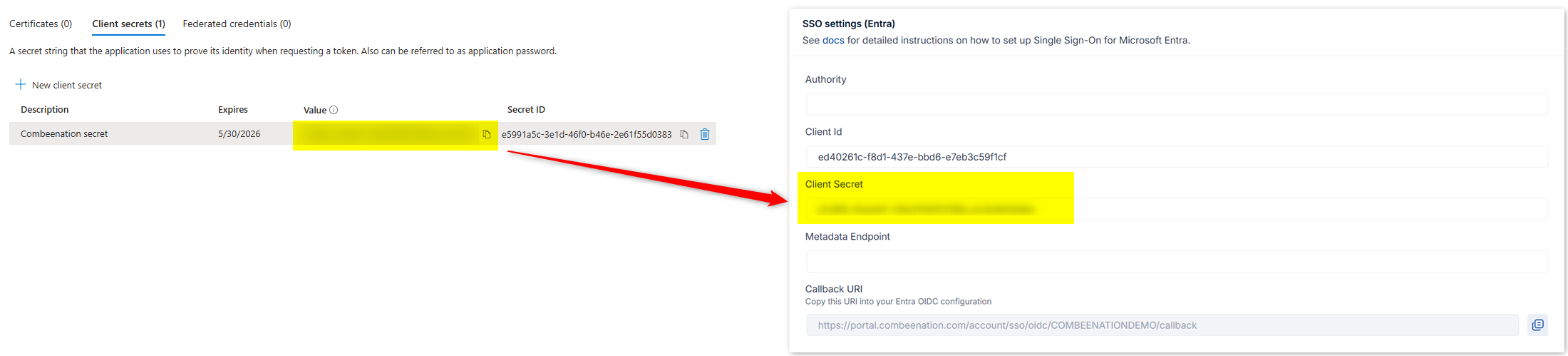 Copy the created secret Value and paste it into the Client Secret field of the Combeenation SSO settings.