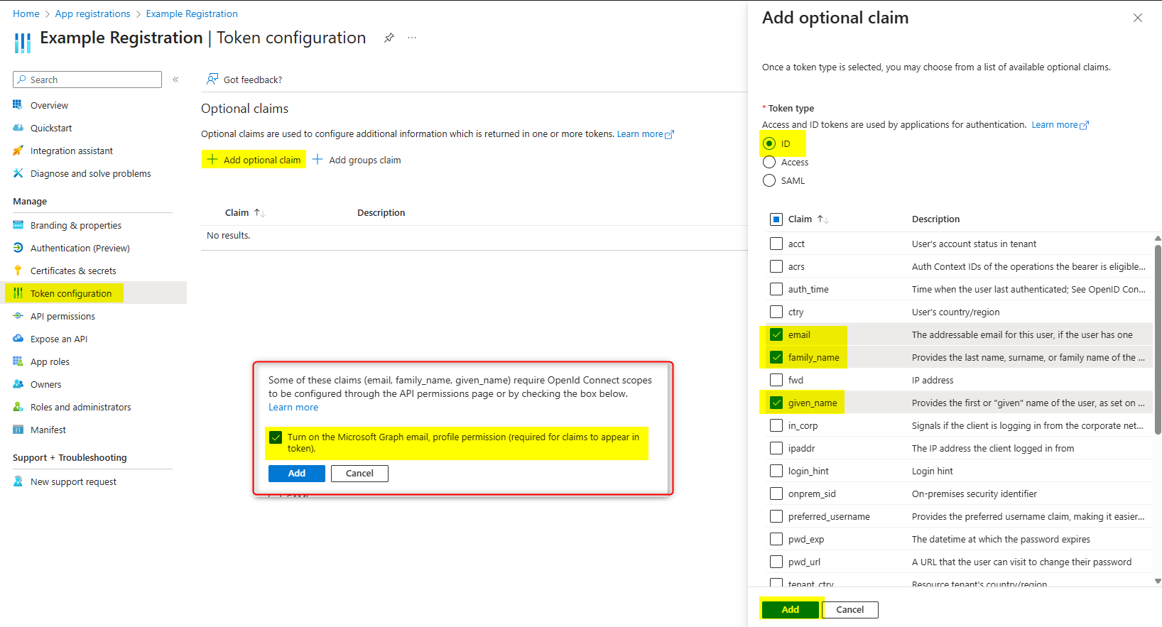 Click Add and then check the Turn on the Microsoft Graph email, profile permission (required for claims to appear in token) option in the pop-up that appears, then confirm again by clicking Add.