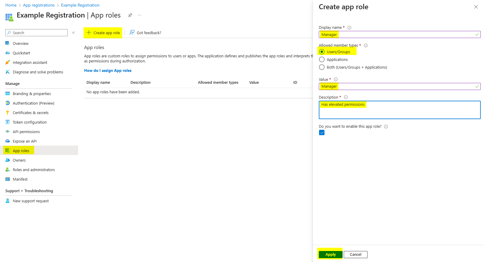 Go to App roles and click on Create app role to define a new role.