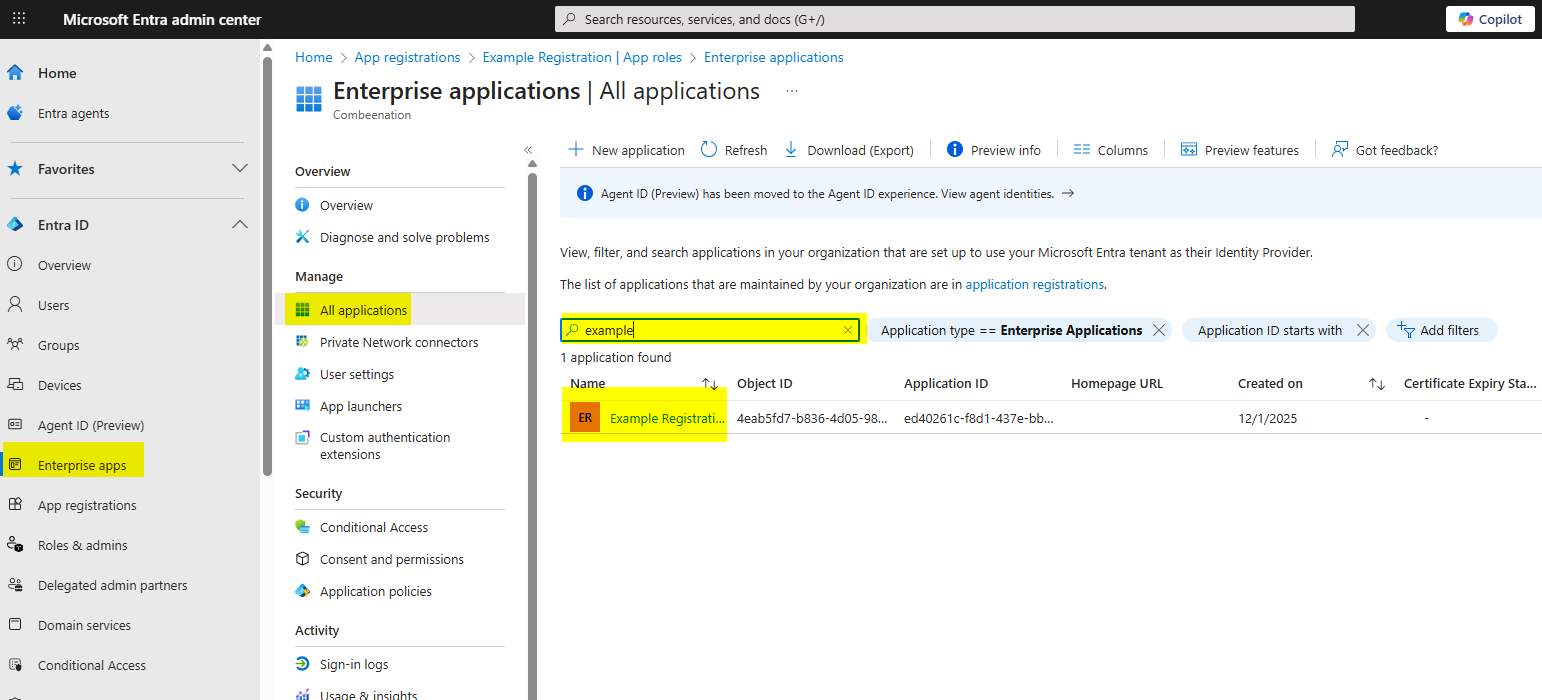 Back in Entra, click on Enterprise apps in the main navigation menu on the left and then open All applications.