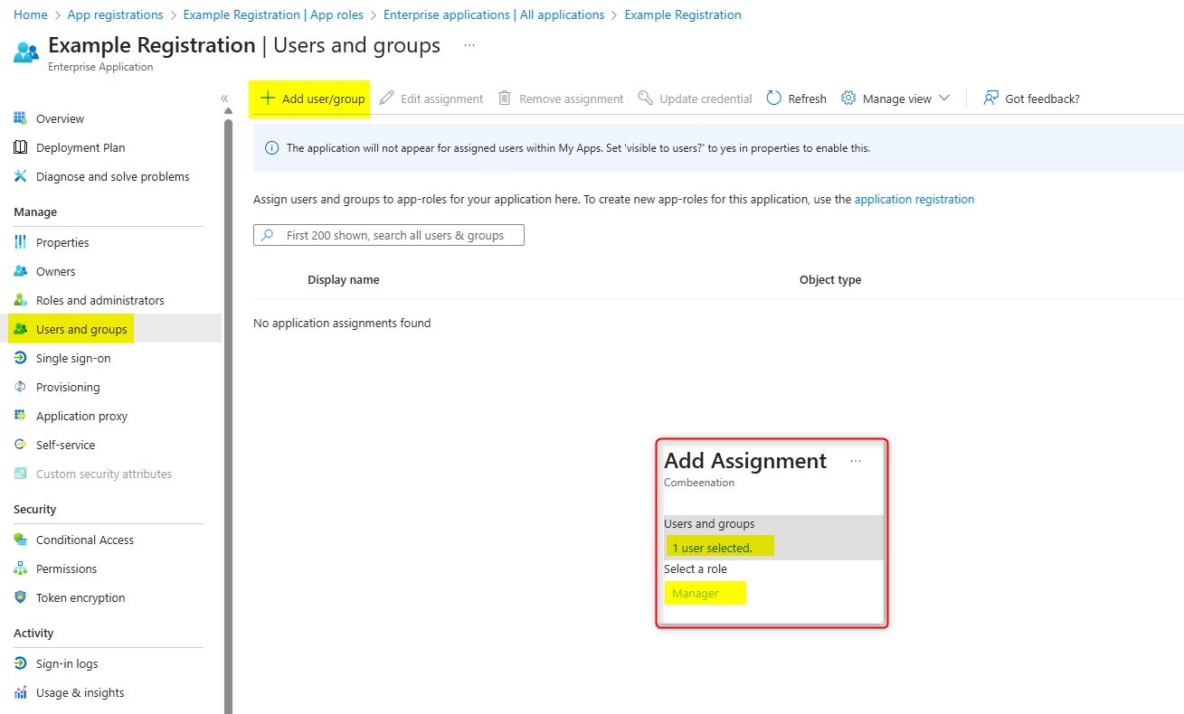 Choose a role for your users (provided you created App Roles in step 6) and finally click Assign to confirm.