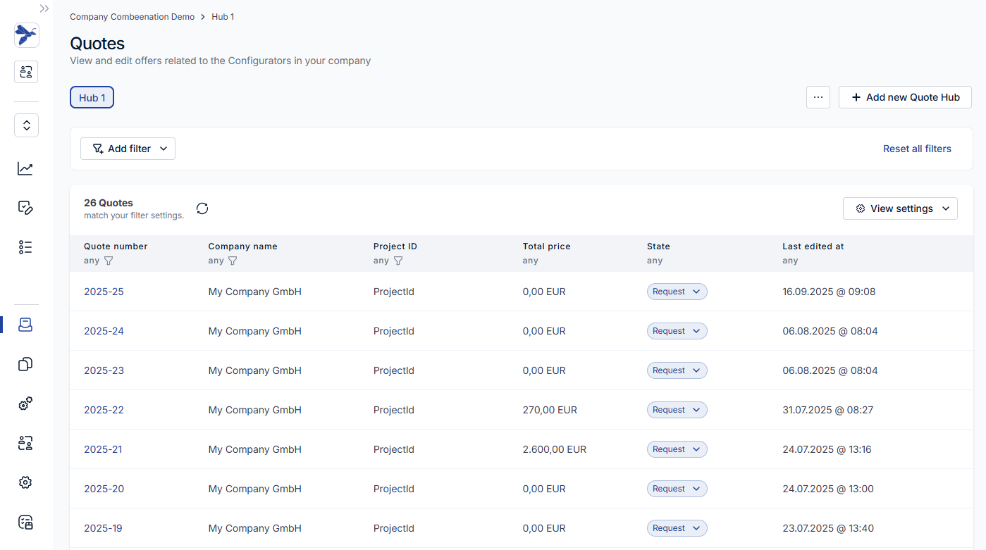 After clicking on Quotes in the left menu bar, you can select the desired quote hub with all created quotes. You can configure your set of columns which should be shown for each quote. Simply configure your view to meet your requirements.